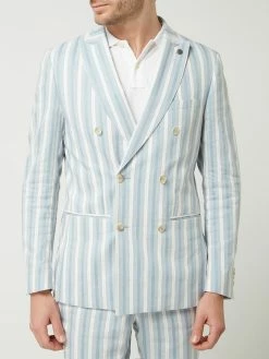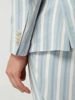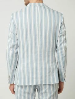 Das Sakko von CG Club of Gents ist aus einer Leinenmischung mit Viskose- und Stretch-Anteil gefertigt. Es kommt in schmaler Passform mit Streifenmuster, steigendem Revers und Kissing Buttons an den Ärmelabschlüssen. Die Kollektion ‘Savile Row’ steht für eine Kombination aus italienischer Raffinesse mit der Wertigkeit, Langlebigkeit und Maskulinität englischer Machart.