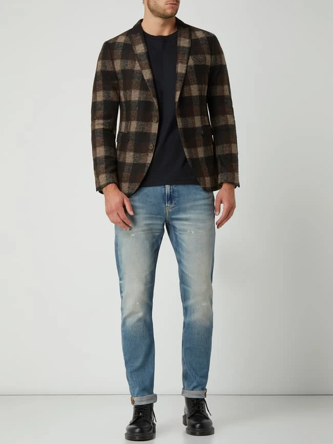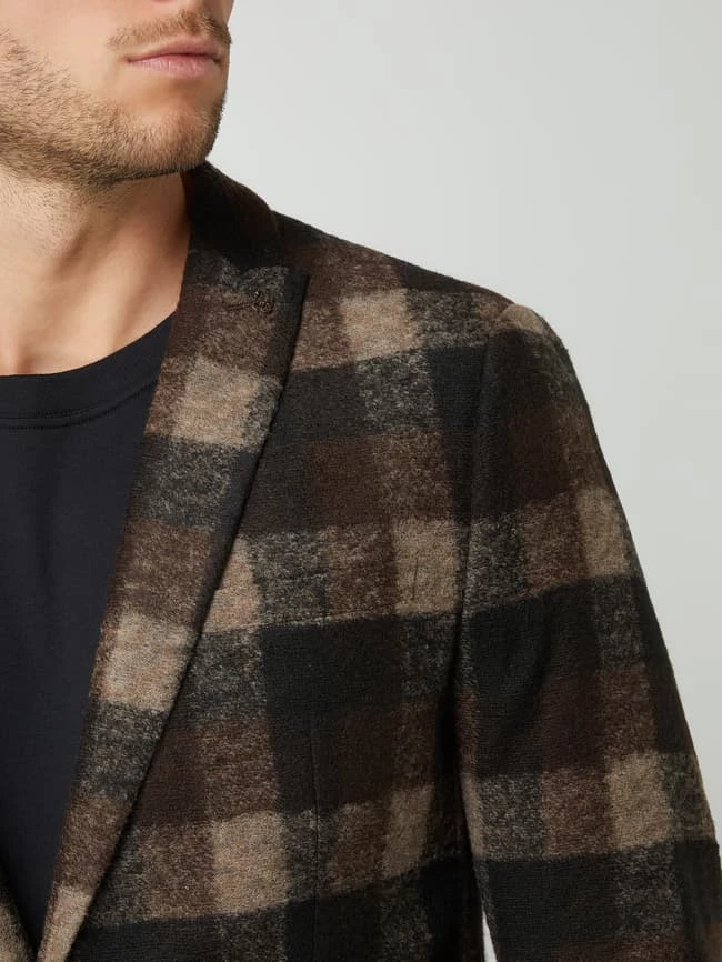Das 2-Knopf-Sakko von CINQUE ist aus einer weichen Materialmischung mit Woll-Anteil gefertigt. Es zeigt sich im Slim Fit mit Gitterkaro, Spitzfasson und paspelierten Pattentaschen.