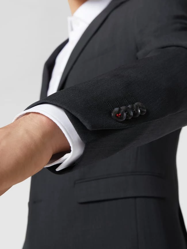 Das Sakko von CINQUE ist aus einer leichten Materialmischung mit Schurwoll- und Stretch-Anteil gefertigt. Es zeigt sich im Super Slim Fit mit fallendem Revers, Kissing Buttons und paspelierten Pattentaschen.