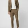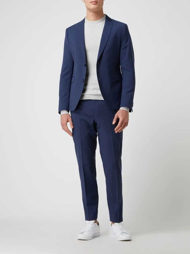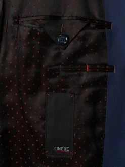 Der schmal geschnittene Anzug von CINQUE ist aus einer Materialmischung mit Schurwoll- und Stretch-Anteil gefertigt. Das Sakko zeigt sich mit steigendem Revers, paspelierten Pattentaschen und Kissing Buttons an den Ärmelabschlüssen.