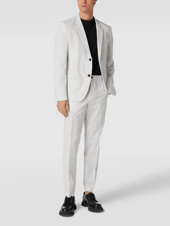 Der Anzug von HUGO ist aus einem strapazierfähigen Material gefertigt und leicht tailliert geschnitten. Er zeigt sich im unifarbenen Design, Sakko mit Pattentaschen und Hose mit Bundfalten.