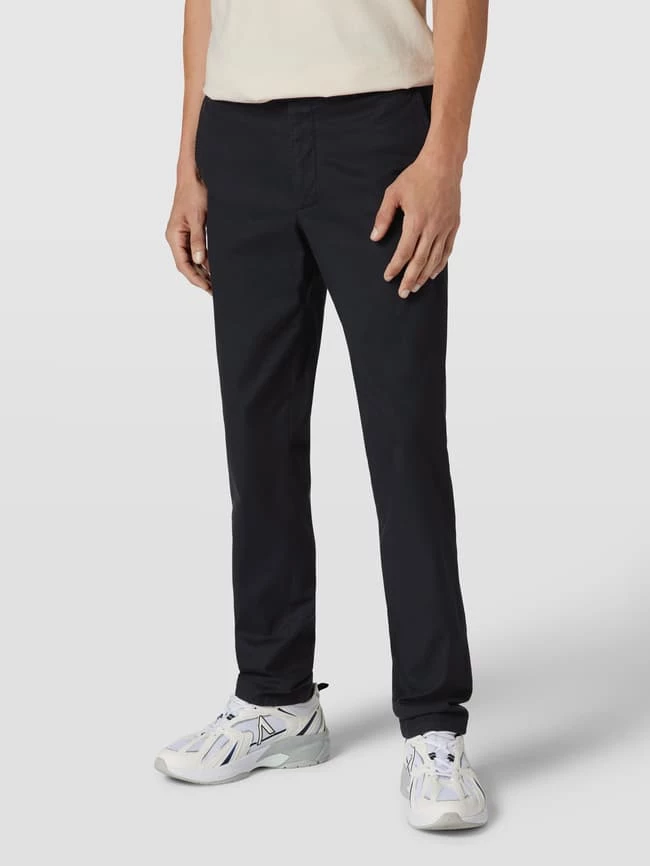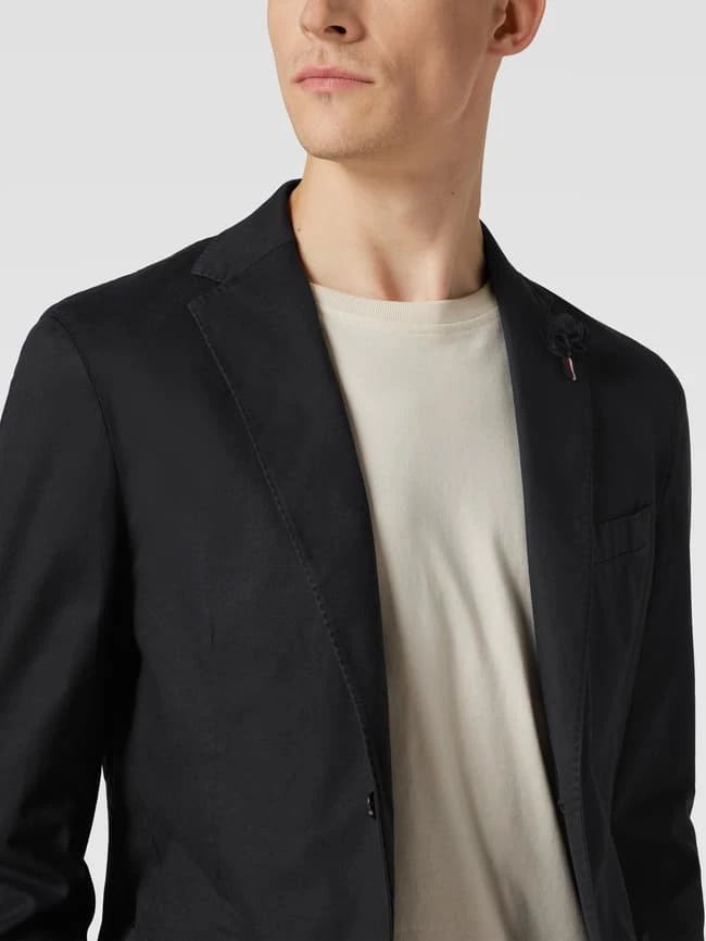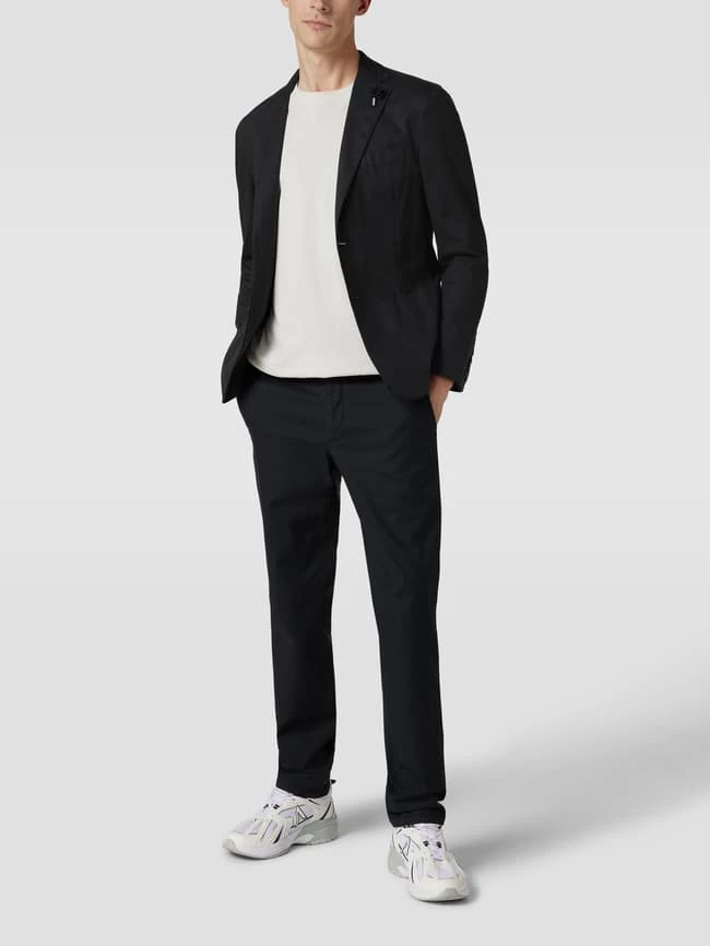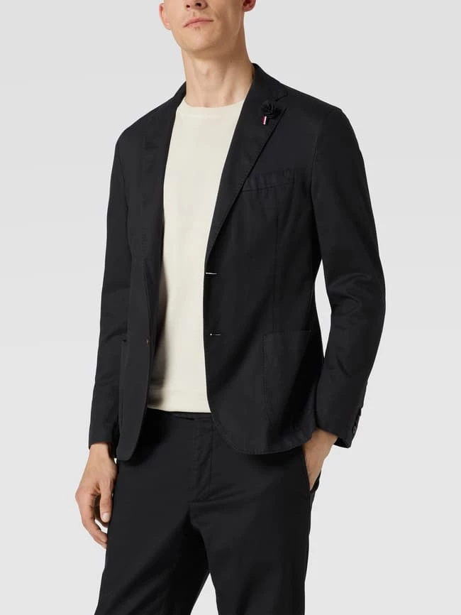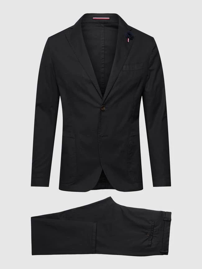 Der Anzug von Tommy Hilfiger ist aus einem Lyocell-Baumwoll-Mix mit Stretch-Anteil gefertigt und gerade geschnitten. Er zeigt sich mit Sakko mit floraler Anstecknadel und Hose mit seitlichen Eingrifftaschen.