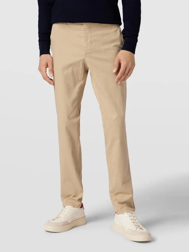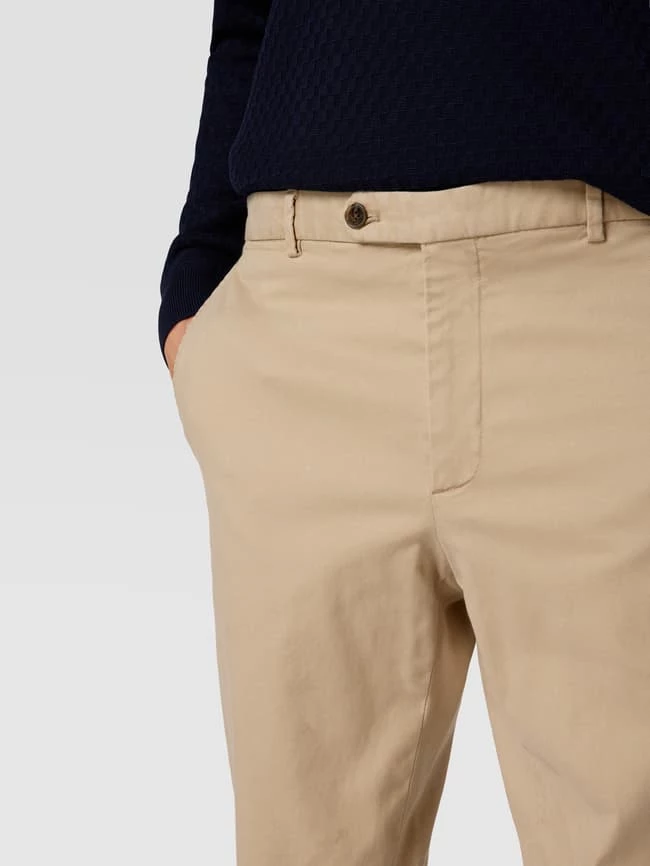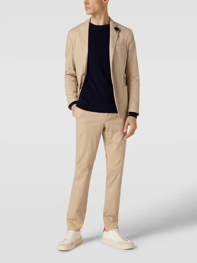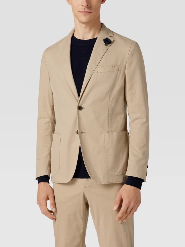 Der Anzug von Tommy Hilfiger ist aus einem Lyocell-Baumwoll-Mix mit Stretch-Anteil gefertigt und gerade geschnitten. Er zeigt sich mit Sakko mit floraler Anstecknadel und Hose mit seitlichen Eingrifftaschen.